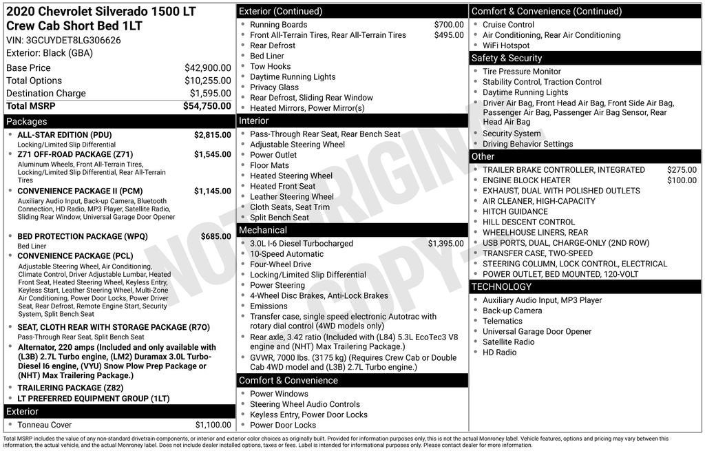 Silverado 1500 LT, 4D Crew Cab, 3.0L I6, 4WD, Black, Jet Black Cloth, 10-Way Power Driver Seat w/Lumbar, 12-Volt Rear Auxiliary Power Outlet, 120-Volt Bed Mounted Power Outlet, 120-Volt Instrument Panel Power Outlet, 2 USB Ports, 2 USB Ports (First Row), 3.73 Rear Axle Ratio, 4-Way Manual Driver Seat Adjuster, 4.2 Diagonal Color Display Driver Info Center, 40/20/40 Front Split-Bench Seat, 4G LTE Wi-Fi Hot Spot Capable, All-Star Edition, Bed Protection Package, Bluetooth® For Phone, Chevrolet Connected Access Capable, Chevytec Spray-On Black Bedliner, Chrome Assist Steps, Chrome Grille, Chrome Mirror Caps, Cloth Rear Seat w/Storage Package, Color-Keyed Carpeting Floor Covering, Compass, Convenience Package, Convenience Package II, Deep-Tinted Glass, Diesel Off-Road Package, Dual Exhaust w/Polished Outlets, Dual-Zone Automatic Climate Control, Electric Rear-Window Defogger, Electrical Lock Control Steering Column, EZ Lift Power Lock & Release Tailgate, Front Frame-Mounted Black Recovery Hooks, Front Rubberized Vinyl Floor Mats, HD Radio, HD Rear Vision Camera, Heated Driver & Front Outboard Passenger Seats, Heated Steering Wheel, Heavy-Duty Rear Locking Differential, High Capacity Air Filter, Hill Descent Control, Hitch Guidance, Keyless Open & Start, Leather Wrapped Steering Wheel, LED Cargo Area Lighting, Locking Tailgate, Manual Tilt-Wheel Steering Column, Manual Tilt/Telescoping Steering Column, Off-Road Suspension, OnStar & Chevrolet Connected Services Capable, Power Door Locks, Power Front Windows w/Driver Express Up/Down, Power Front Windows w/Passenger Express Down, Power Rear Windows w/Express Down, Power Sliding Rear Window w/Rear Defogger, Preferred Equipment Group 1LT, Radio: Chevrolet Infotainment 3 Plus System, Rear 60/40 Folding Bench Seat (Folds Up), Rear Dual USB Charging-Only Ports, Rear Rubberized-Vinyl Floor Mats, Rear Vision Camera, Rear Wheelhouse Liners, Remote Keyless Entry, Remote Vehicle Starter System, Single-Zone Manual/Semi-Automatic Air Conditioning, SiriusXM w/360L, Steering Wheel Audio Controls, Steering Wheel Mounted Electronic Cruise Control, Theft Deterrent System (Unauthorized Entry), Trailering Package, Tri-Fold Hard Tonneau Cover (LPO), Universal Home Remote, Urethane Steering Wheel, Z71 Off-Road Package.